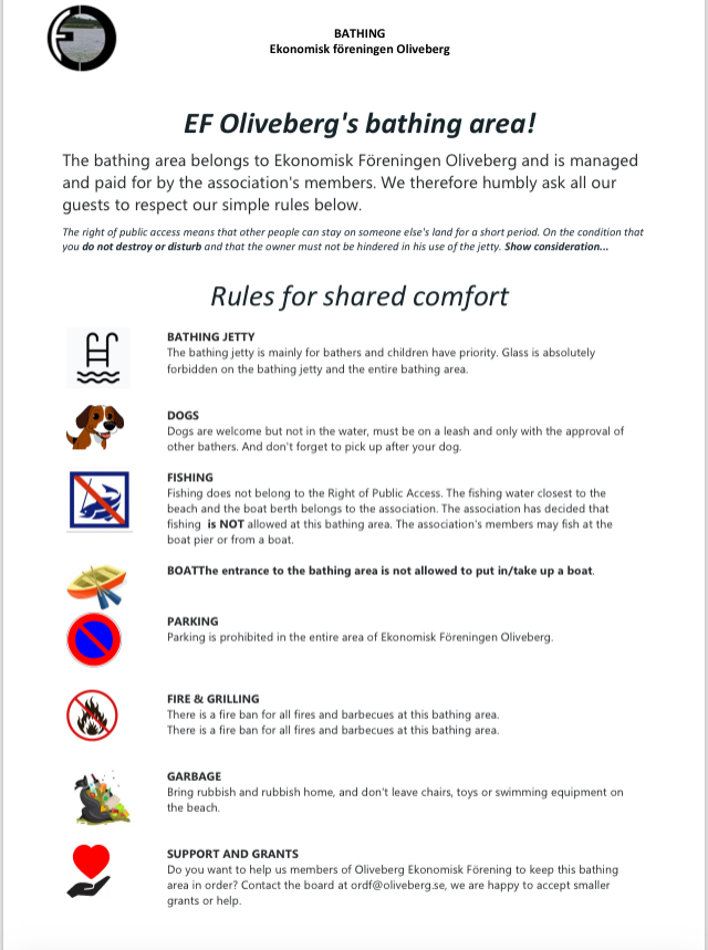 - You reach the bath by taking the road to the left of the cottage. Follow the arrow down the path to the bath. Please be considerate and do not cross our lot down to the bath. Show consideration when you are in the bathing area. The bathing jetty is primarily for bathers, and please follow the bathing rules found at the bathing area. If you are alone, it is no problem to lie there and sunbathe, but if you are accompanied by others, you should move to the lawn. It is not allowed to fish from the bathing jetty, but you can fish from the boat jetty.